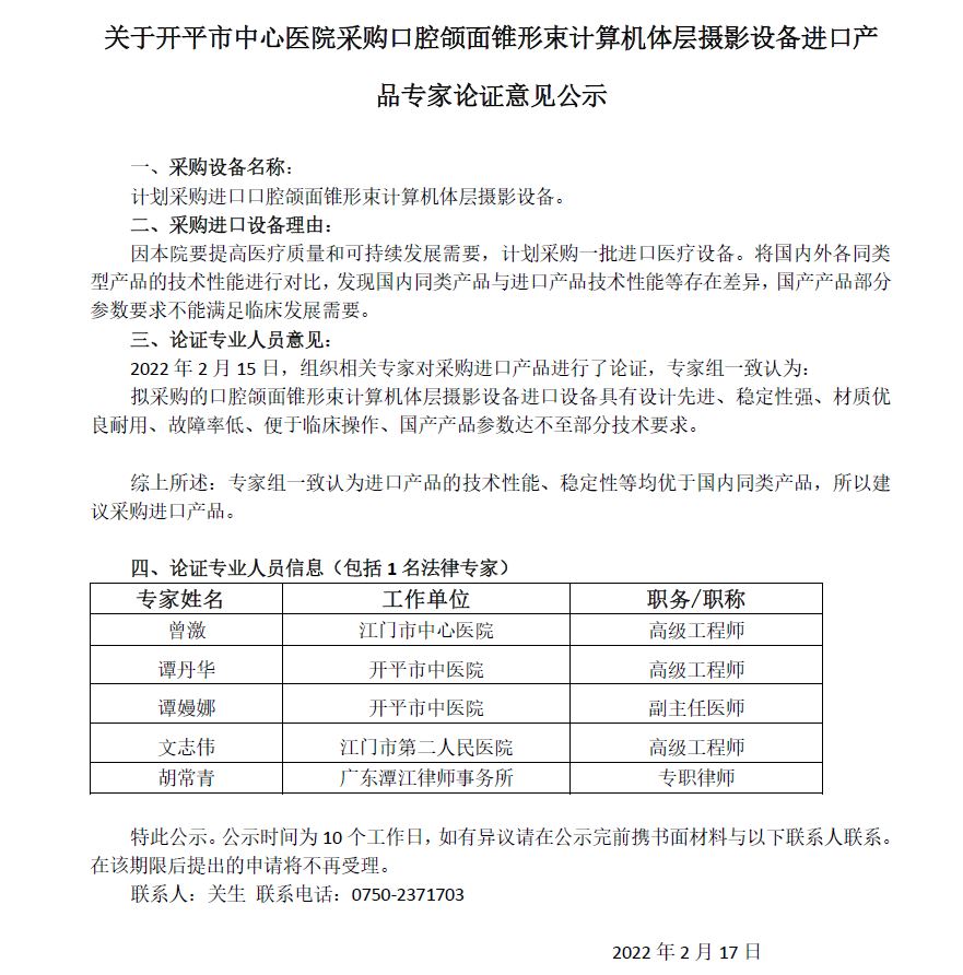 关于开平市中心医院采购口腔颌面锥形束计算机体层摄影设备进口产品专家论证意见公示