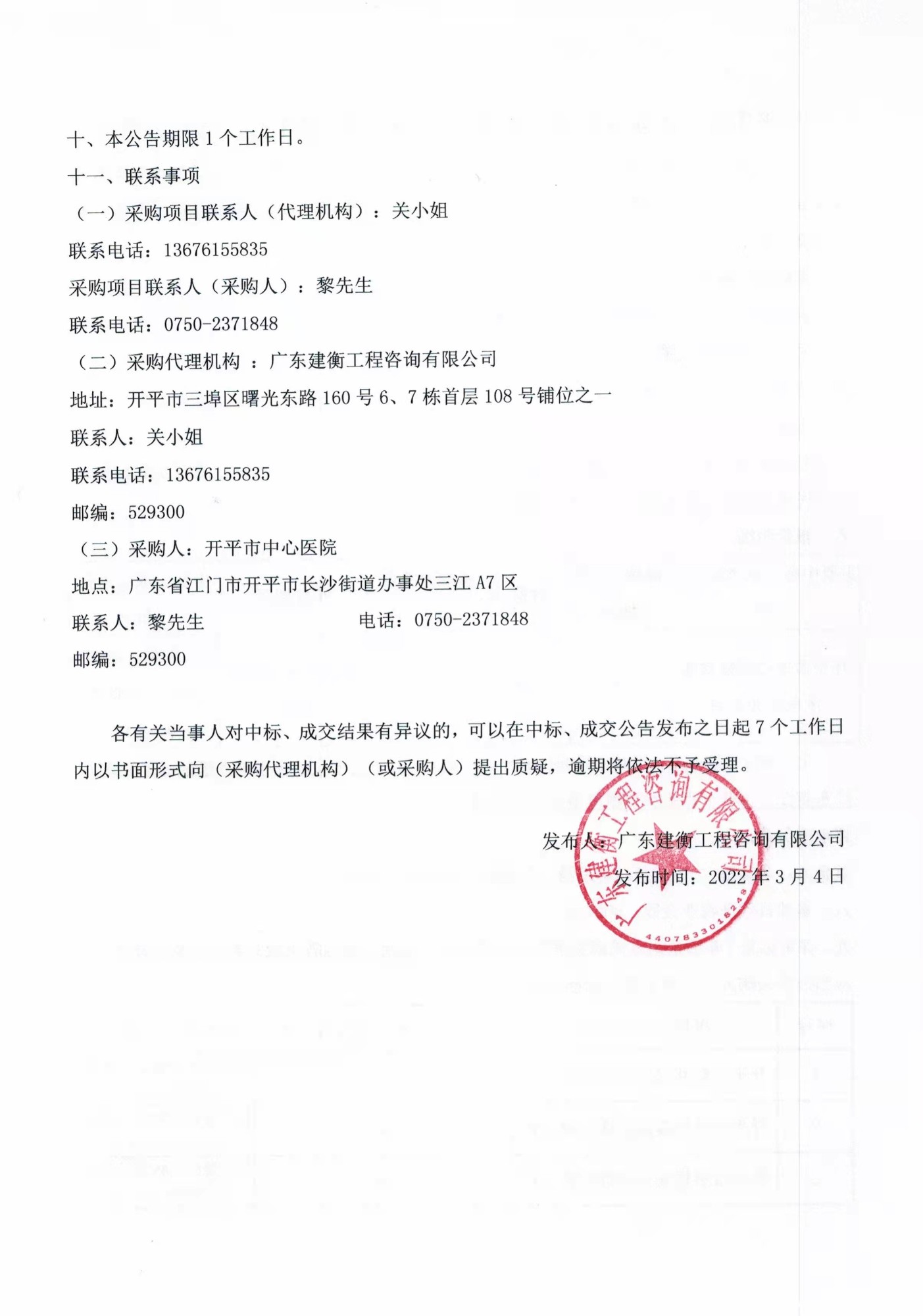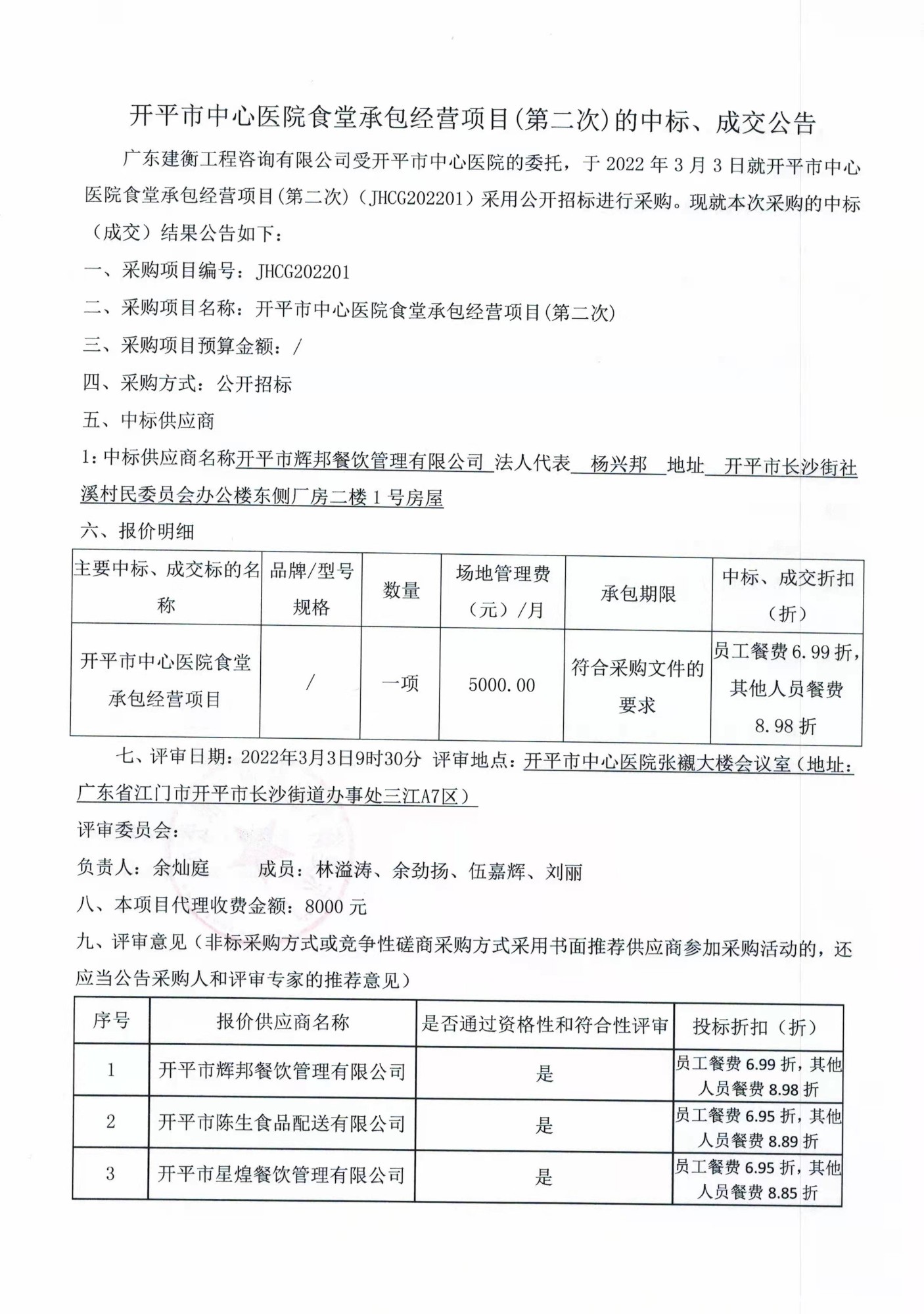开平市中心医院食堂承包经营项目(第二次)的中标、成交公告