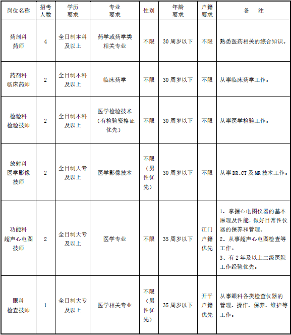 (二)因岗位性质要求,个别岗位工作时间按实际排班。(四)身体健康,诚实守信,无违反计生政策,无犯罪记录。有意者请携带本人身份证、户口簿(复印件要求户主页和本人页复印在同一页)、毕业证书及相关证书的原件及复印件,另近期红底一寸彩色照片1张,前往本院人事保卫科递交资料。或将简历和相关资料发至电子邮箱:kptjs[at]163[dot]com,邮箱主题注明“姓名+应聘岗位+学历”。合则约见,择优录用。星期一至星期六上午(上午8:30-11:00,下午2:30—5:00)签订劳动合同,试用三个月,试用不合格,终止劳动关系。本次招考人员属于本院编外人员,投保“五险二金”,享受相关岗位待遇以及伙食补助等。地址:开平市长沙街道办事处三江A7区开平市中心医院张襯大楼7楼人事保卫科