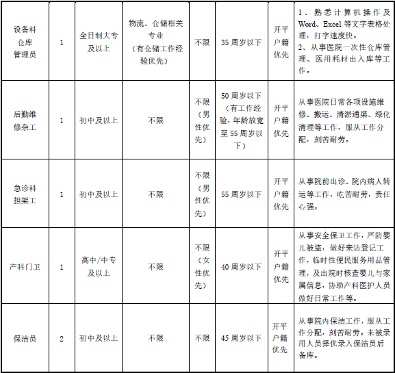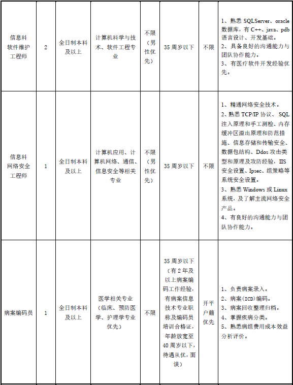 根据医院工作需要,现面向社会公开招聘以下工作人员,招聘岗位、资格条件、福利待遇如下: