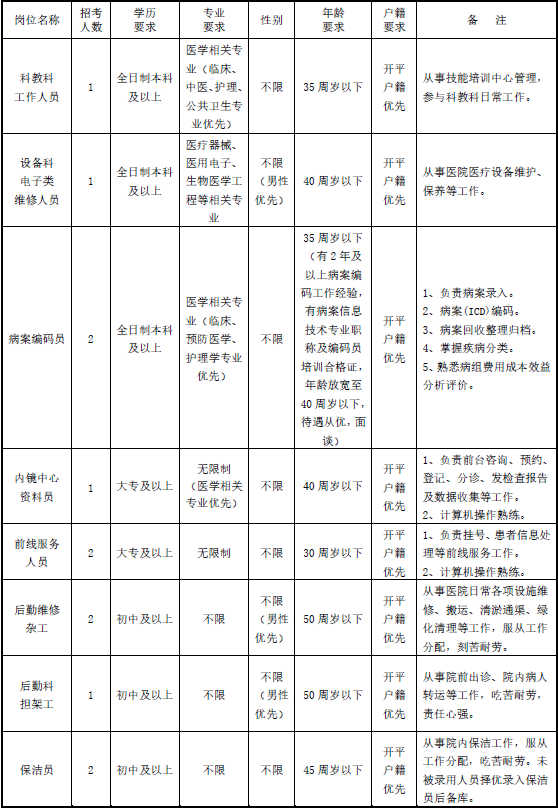 有意者请携带本人身份证、户口簿(复印件要求户主页和本人页复印在同一页)、毕业证书及相关证书的原件及复印件,另近期红底一寸彩色照片1张,前往本院人事保卫科递交资料。或将简历和相关资料发至电子邮箱:kptjs[at]163[dot]com,邮箱主题注明“姓名+应聘岗位+学历”。合则约见,择优录用。
