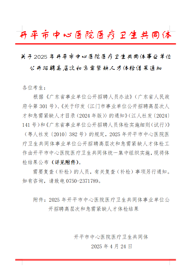 关于2025年开平市中心医院医疗卫生共同体事业单位公开招聘高层次和急需紧缺人才体检结果通知 发布时间:2025-04-24 19:41 本文来源: 人保股 分享到: 附件:2025年开平市中心医院医疗卫生共同体事业单位公开招聘高层次和急需紧缺人才体检结果通知.xlsx 扫一扫 手机端浏览