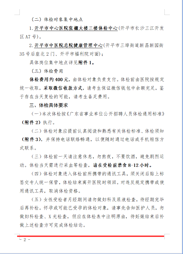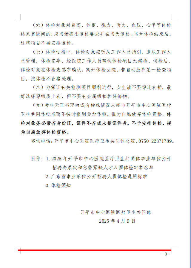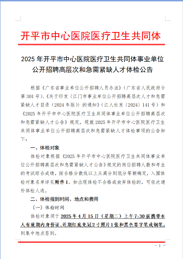 2025年开平市中心医院医疗卫生共同体事业单位公开招聘高层次和急需紧缺人才体检公告 发布时间:2025-04-09 16:23 本文来源: 人保股 分享到: 附件1:2025年开平市中心医院医疗卫生共同体事业单位公开招.xls附件2:广东省事业单位公开招聘人员体检通用标准.doc附件3:体检须知.doc 扫一扫 手机端浏览