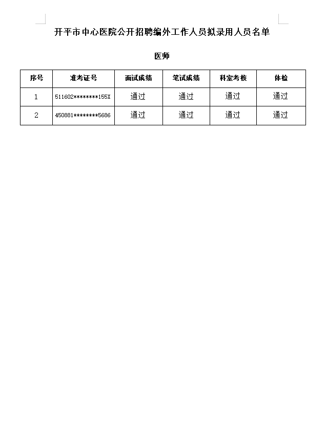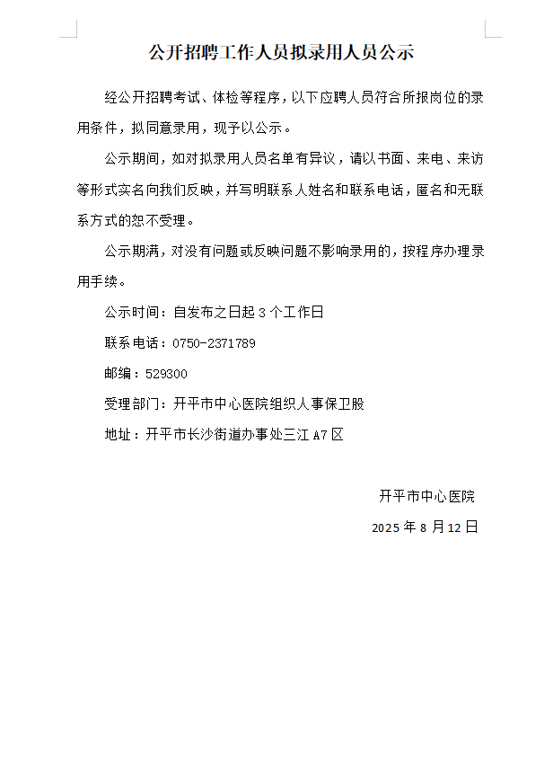 公开招聘工作人员拟录用人员公示