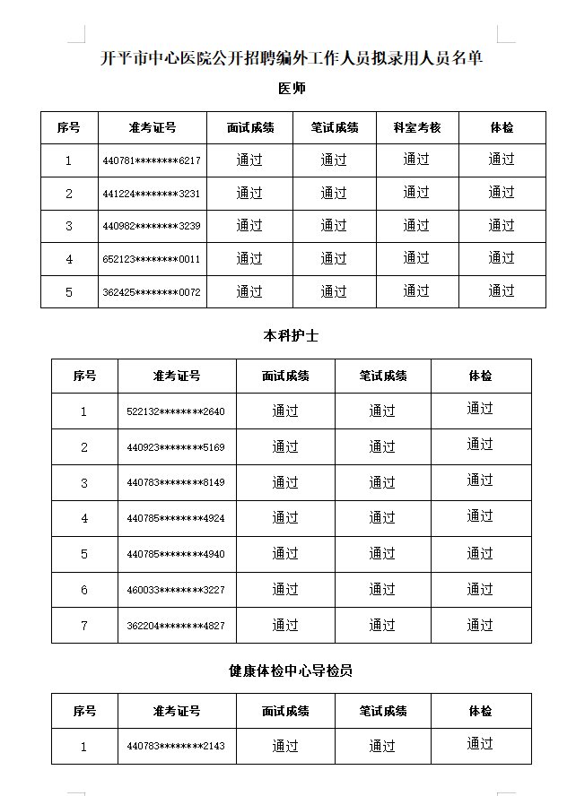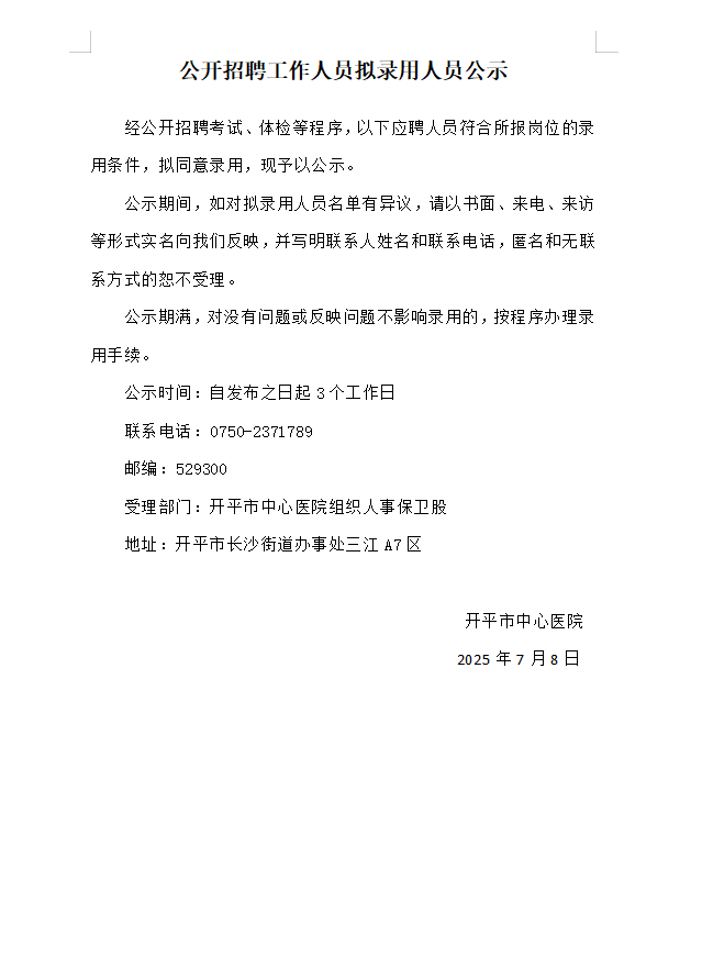 公开招聘工作人员拟录用人员公示