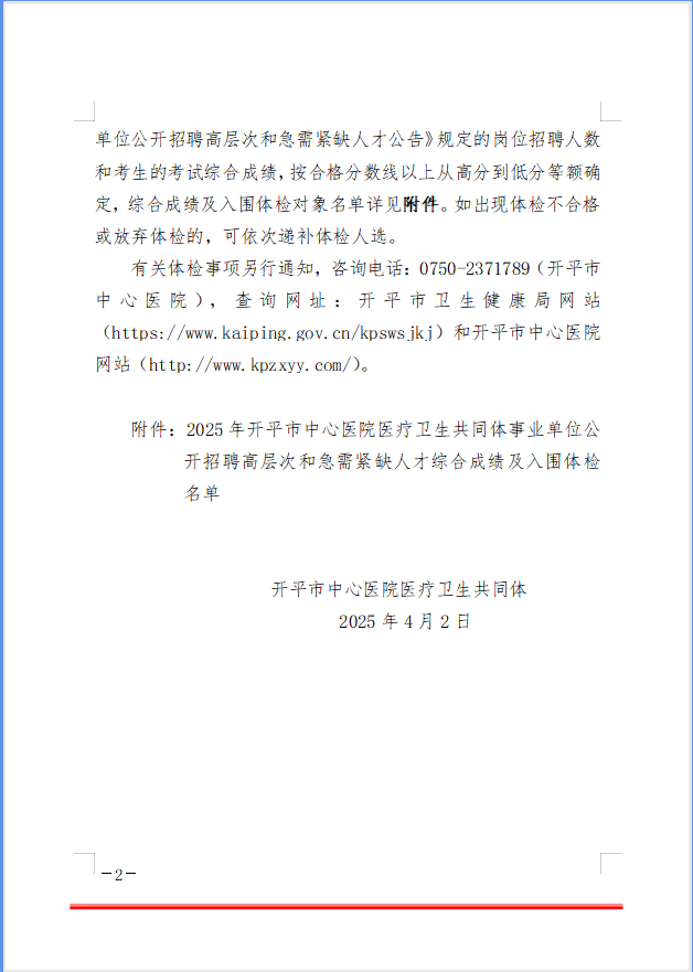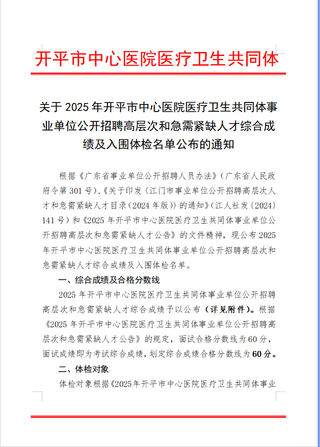 关于2025年开平市中心医院医疗卫生共同体事业单位公开招聘高层次和急需紧缺人才综合成绩及入围体检名单公布的通知 发布时间:2025-04-02 18:21 本文来源: 人保股 分享到: 附件:2025年开平市中心医院医疗卫生共同体事业单位公开招聘.pdf 扫一扫 手机端浏览