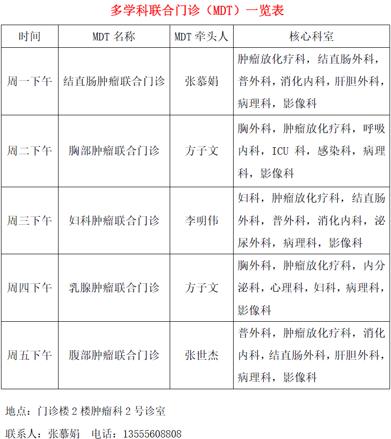MDT(Multiple Disciplinary Team)在医学中是指多学科会诊,由多学科专家针对某一种或某一系统疾病的病例进行讨论,在综合各学科意见的基础上为病人制定出最佳的治疗方案的治疗模式。开平市中心医院结直肠肿瘤多学科会诊是由我院多个科室的顶尖专家组成的一个多学科会诊的团队。分别有肿瘤外科专家方万强党委书记,肿瘤内科专家张慕娟主任、叶大胜医生,腔镜微创中心主任司徒升主任,肝胆外科张世杰主任、影像医学科陈峥主任,病理科张朝清主任,胃肠外科伍炎俊副主任医师及莫健文医生。