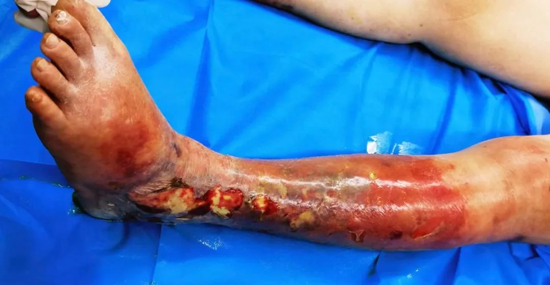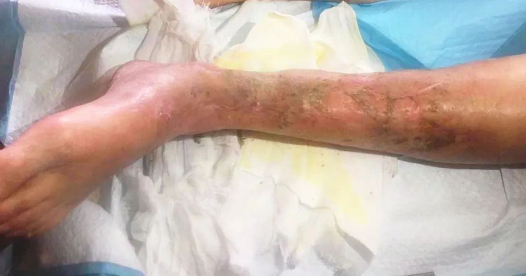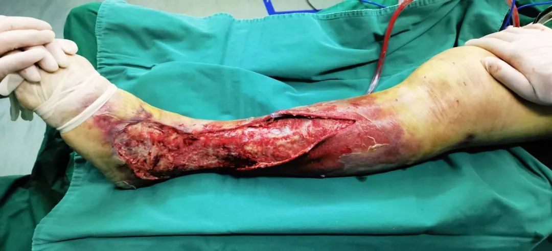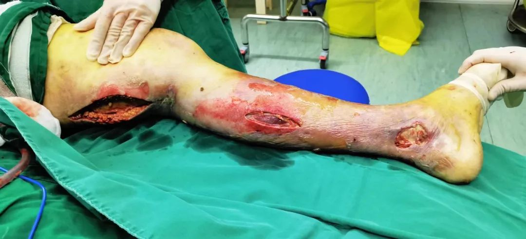 烧伤整形科经过仔细分析病情、组织多学科会诊,为患者制定有效治疗方案,做好术前必要准备,急诊送手术室进行了创新的保留皮肤穿支血管的精细化清创处理,达到最大程度清除坏死组织同时保存了有活力的皮肤,为减少创伤及后续封闭创面治疗创造有利条件,结合持续负压封闭引流技术、植皮手术以及抗感染、改善全身营养和脏器功能维护等治疗,最后为患者完整保全肢体成功。