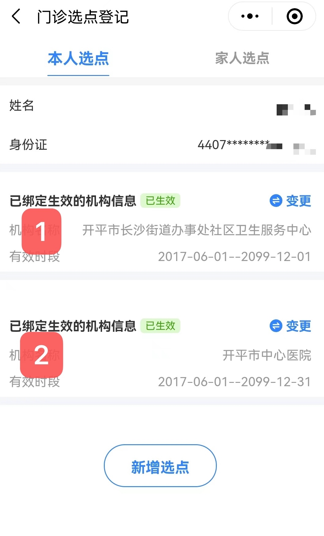 3、首次选点点击“新增选点”:①必须先新增一家一级以下医疗机构 ②再新增“开平市中心医院”