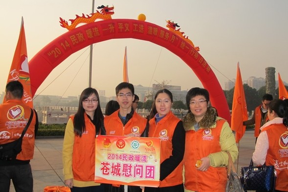 我院团委积极响应“奉献爱心,温暖人间”的活动主题,组织团员青年与八中、风采中学、花王涂料、食品药品监督局、苍城镇圩社区义工服务站结对到苍城镇进行送温暖活动,将前期筹集的慰问资金和物品送至苍城镇敬老院、扶困助学对象、特困户等,帮助有困难群众过一个欢乐祥和的春节。