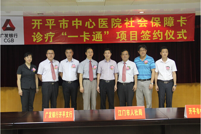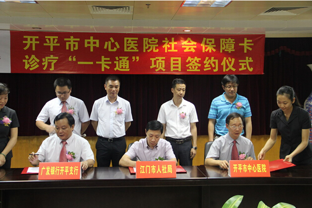 6月17日上午,我院在门诊四楼会议室举行社会保障卡诊疗“一卡通”项目签约仪式。江门市人力资源和社会保障局信息中心、广发银行开平支行、我院负责人出席了签约仪式。