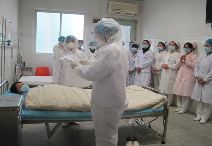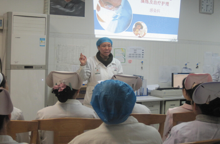 为了做好院内人感染H7N9禽流感病毒防控组织协调工作,进一步加强人感染H7N9禽流感患者入院时应对处置能力,本院2014年12月26日组织一场模拟有关人感染H7N9禽流感病毒患者入院应急演练的护理查房。参加应急演练护理人员包括:感染科全体人员以及内科片、门急诊片的部分护理人员,共有40多人。