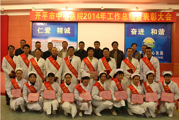 邝家俊书记对我院2014年度工作作了回顾和总结。在市委、市政府和卫生计生局的正确领导下,我院以党的十八大和十八届三中、四中全会精神为指导,践行党的群众路线,推进区域医疗中心建设,在行风建设、医疗安全、医疗质量、专科建设、人才建设、药事管理和后勤管理等各方面均取得成效。如新增加广东医学院重点学科一个、江门市临床重点专科两个、门诊西药房被评为开平市十佳服务窗口等。