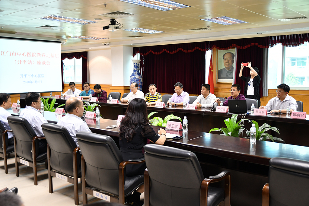 3月6日下午,江门市中心医院专家组一行21人在李宇明院长带领下,到我院开展新春走基层活动,市委常委陈伟成、市府办副主任吴进进、卫计局局长黄奕强、副局长李活船和我院院长方万强等有关领导陪同,院内各科室负责人也参与了本次活动。