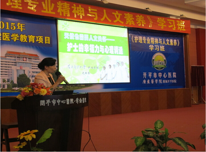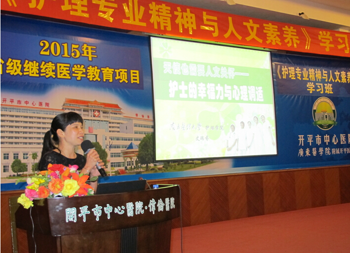 2015年4月21日在门诊五楼学术厅举办主题“护理专业精神与人文素养”培训班,共500多名护理人员参加。此次学术会议由开平市护理学会主办、开平市中心医院承办,特邀原南方医科大学护理学院副院长史瑞珍教授前来授课,与大家分享课题:护士幸福力与心理调适。课堂上,她生动、幽默的精彩讲课和互动,给我们护理人的成长带来无限的正能量。